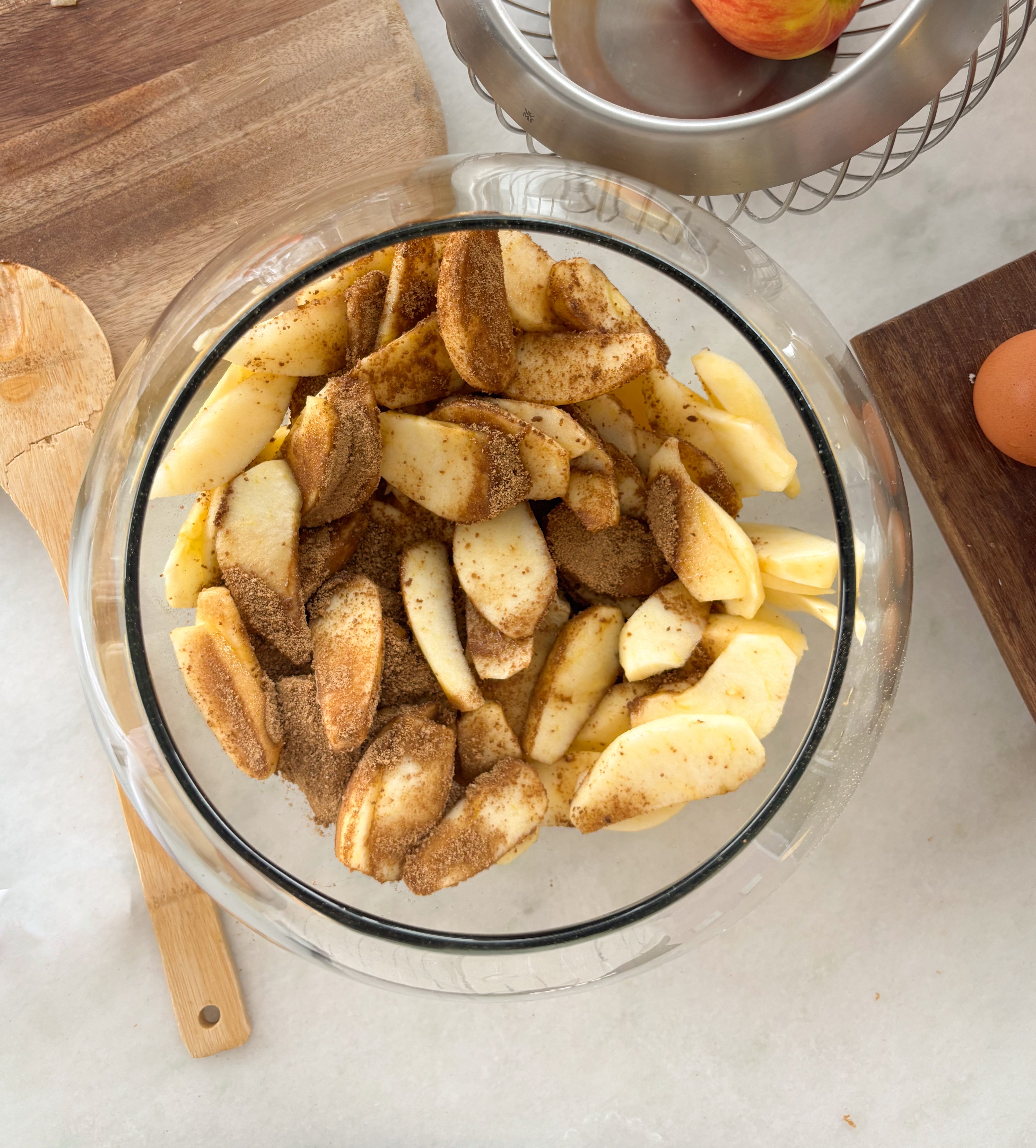 Misture bem e despeje sobre a base de biscoitos. Cubra com as fatias de maçã e leve ao forno a 170 graus por aproximadamente 1 hora.